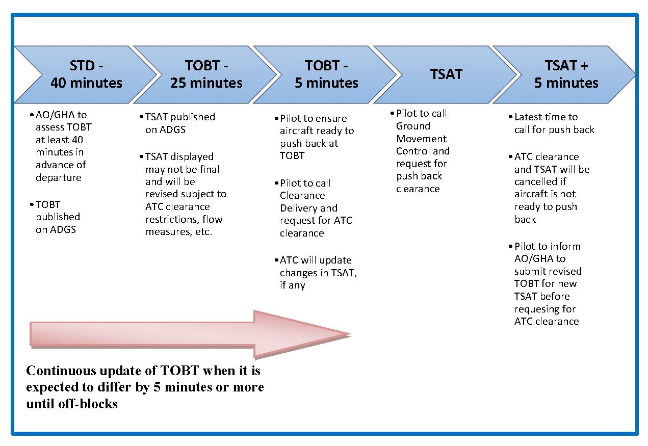 3.10 Flights with an invalid or expired TOBT will be instructed by ATC to update TOBT when requesting for clearance. For non-compliant flights, delays can be expected. AO or GHA are strongly encouraged to update TOBT as soon as any expected delay to the aircraft readiness for pushback is made available to avoid unnecessary hold-ups.