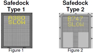 | 1.4.4 | In bad weather conditions, the docking system may go into downgrade mode. The display will show the aircraft type and “SLOW” and the scrolling arrows are disabled (see figure 12). When the system has detected the aircraft, the solid yellow closing rate bar appears. Docking process is allowed to continue but pilots should exercise caution. | Figure 11Informs the pilot that the aircraft travelling speed is too fast. Pilot to slow down the speed. Similar for both Safedock Type 1 and Type 2 | ||