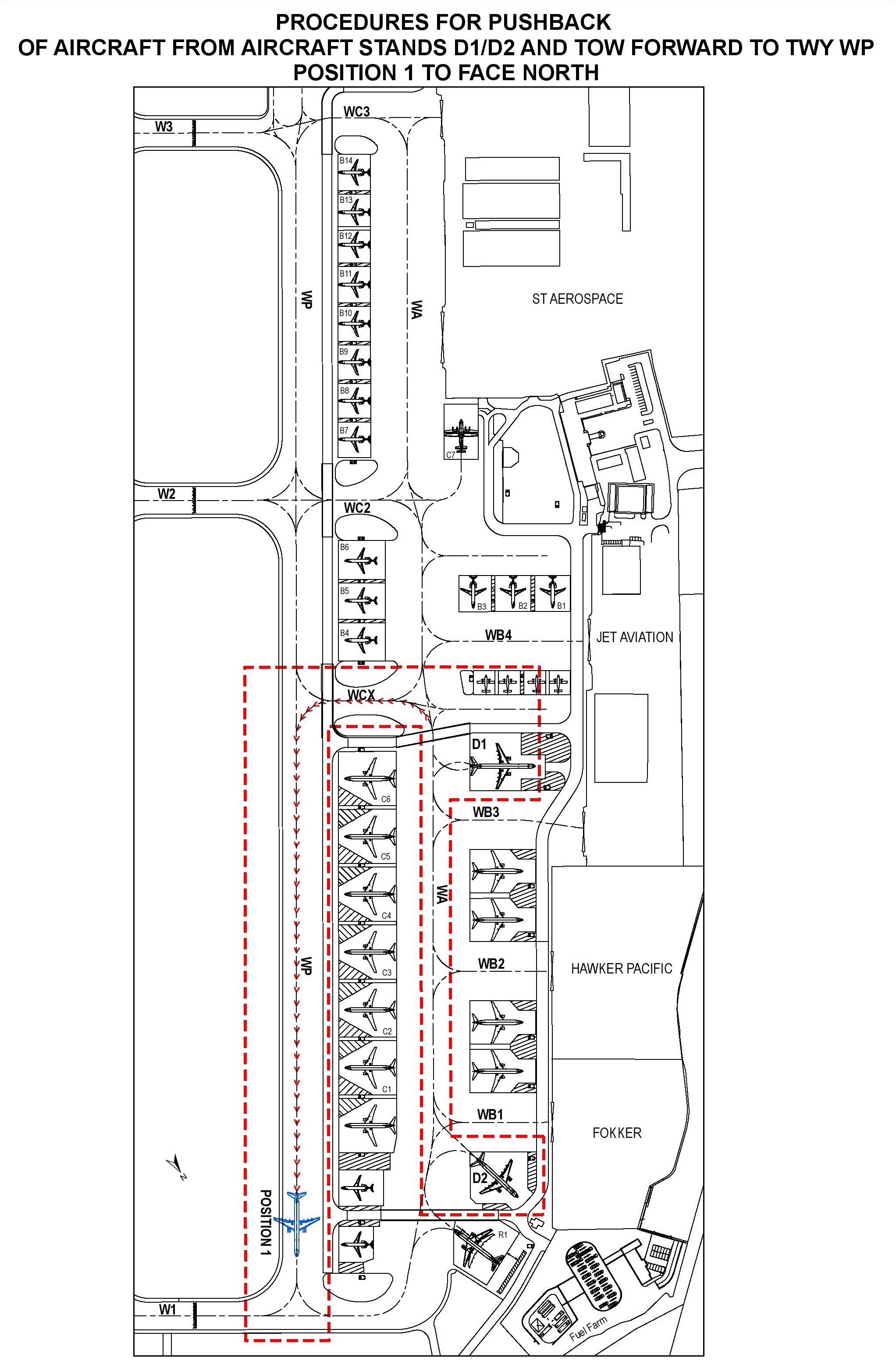 | D1/D2 (for B757-200 and C130) | PUSHBACK AND TOW FORWARD TO TWY WP | |